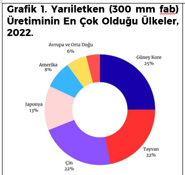 Küresel talepteki artışa paralel olarak yarıiletken sektörü önemli bir büyüklüğe ulaşmıştır. 2024 yılında 681 milyar dolar küresel pazar büyüklüğüne ulaşan sektörün 2025 yılı sonunda 755 milyar dolar seviyesine çıkması beklenmektedir. Geleceğe yönelik tahminlerde ise, 2032 yılında pazar büyüklüğünün yıllık ortalama %15 büyümeyle 2 trilyon doları geçeceği öngörülmektedir (Fortune, 2025). 2025 yılının ilk altı ayında 346 milyar dolar değerinde yarıiletken satışı gerçekleştirilmiştir. Haziran ayında ise küresel yarıiletken satışları önceki yılın aynı ayına kıyasla %19.6 artışla 59.9 milyar dolar seviyesinde gerçekleşmiştir (SIA, 2025). Küresel yarıiletken pazarı az sayıda ülke ve firma tarafından domine edilmektedir. Üretim noktasında pazarın hâkim firmaları büyük ölçüde Tayvan ve Güney Kore’de yer almaktadır. Tayvan, Çin ve Güney Kore birlikte küresel yarıiletken üretiminin dörtte üçünü gerçekleştirmektedir, Amerika, Japonya ve bazı Avrupa ülkeleri ile Singapur gibi Güneydoğu Asya ülkelerinin de küresel üretimde kısıtlı bir payı bulunmaktadır (Grafik 1).