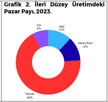 Yarıiletkenler sektörüne daha yakından bakıldığına Apple’ın M serisi işlemcileri gibi teknoloji seviyesinin çok daha üst noktalarda olduğu ileri düzey işlem kapasitesine sahip ve düşük nanometrik ölçekli yarıiletkenler pazarında durumun farklılaştığı görülmektedir. Tayvan’ın bu alanda küresel üretimin üçte ikisini tek başına gerçekleştirdiği görülmektedir (Grafik 2). Bu alanda diğer önemli üç üretim merkezi Güney Kore, ABD ve Çin’dir. Tayvanlı ve Güney Koreli firmaların yurtdışındaki yatırımları da düşünüldüğünde bu ülkelerin küresel payının daha fazla olduğu söylenebilir.