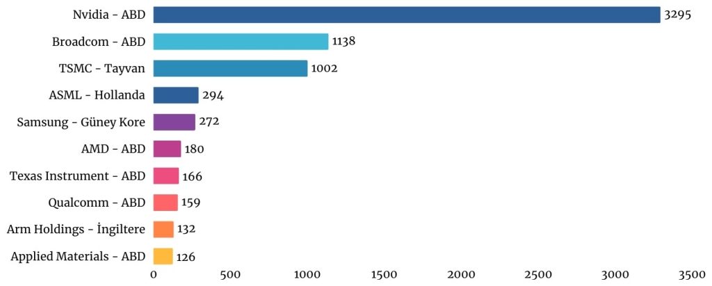 Yarıiletken üretimine hâkim ülkelerle piyasayı domine eden firmalar birbirinden farklılaşmaktadır. Bu farkın temel nedeni yarıiletken üretimiyle tasarımının farklı mühendislik becerileri gerektirmesidir. Sektörün lider tasarım firması olan Nvidia, verilerin derlendiği tarih itibarıyla 3,3 trilyon dolar piyasa değerine ulaşmıştır (Grafik 3). Bu tutarın Türkiye’nin gayrisafi yurtiçi hasılasının neredeyse 3 katına denk geldiği düşünüldüğünde, piyasanın ne denli büyüdüğü daha net anlaşılabilir. Aşağıdaki grafikte, yarıiletken sektörüne hâkim en büyük on firmanın piyasa değerine yer verilmektedir.