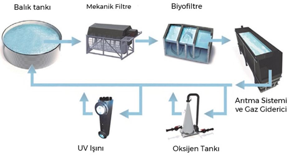 - Sistem içerisinde yemler balıklar tarafından sindirilerek enerji ve büyüme için kullanılırken; karbondioksit, amonyak ve dışkı gibi atıklar suya karışır. Bu nedenle çiğ balık gibi organik maddeler yerine kuru yemler kullanıldığı takdirde yemden maksimum verim alınmakta, amonyak atılımı azalmakta ve filtre sistemine olan yük düşmektedir. Ayrıca yem dönüşüm oranı (FCR) iyileşirken üretim verimliliği de artmaktadır (FAO, 2015).